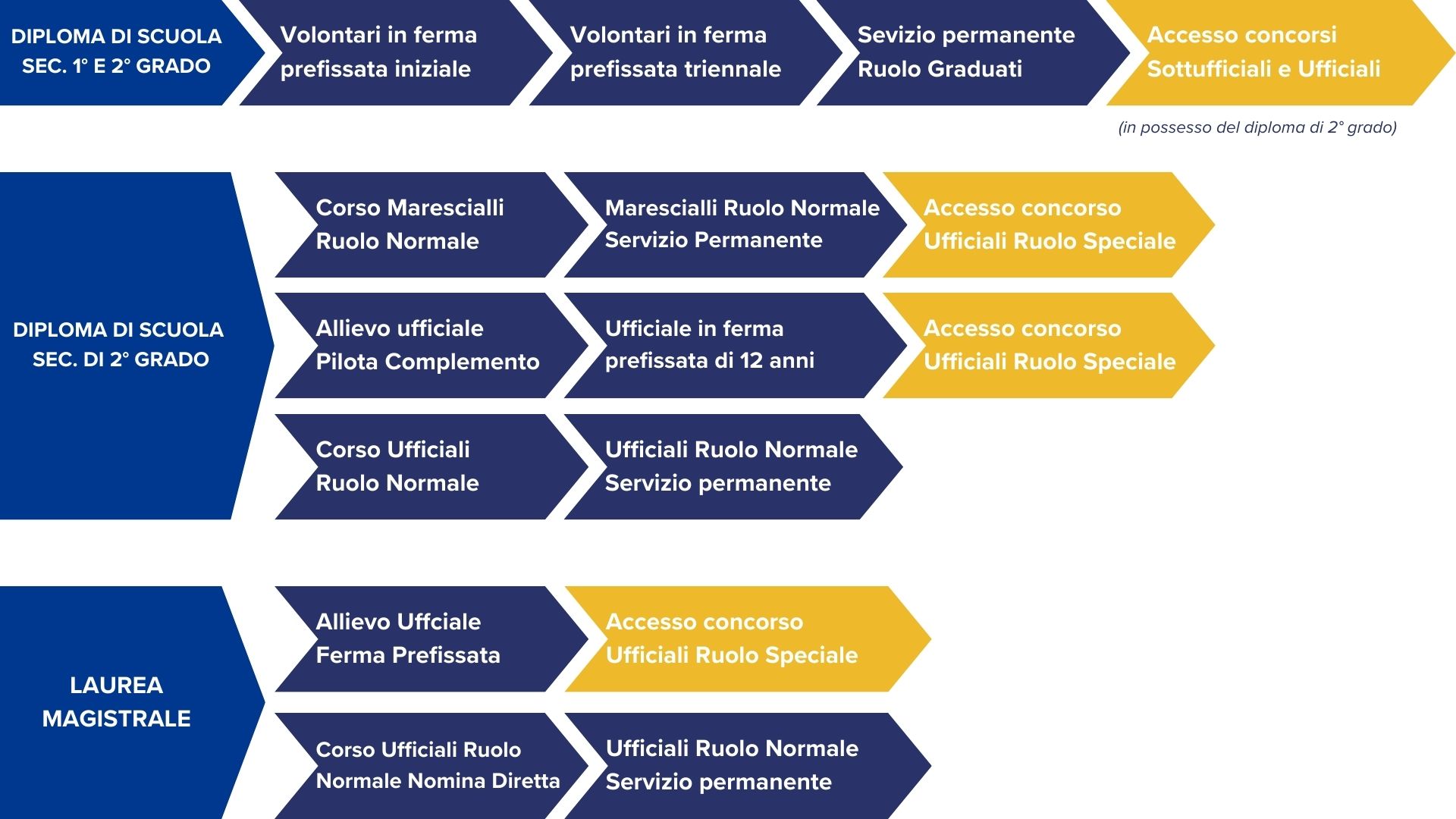 - Da qui si può accedere al ruolo graduati e successivamente concorrere per diventare Sottufficiale (Sergente o Maresciallo) o ufficiale tramite concorsi interni (se in possesso del Diploma di scuola secondaria di 2° grado)